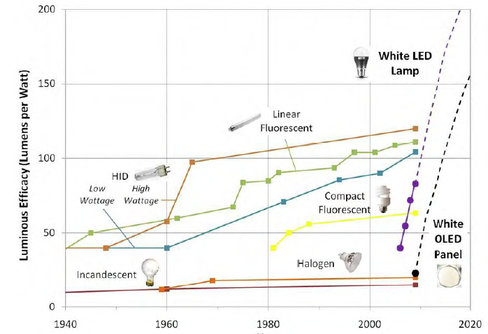 Here below is a nice time line graph of the in use and commercially available lighting technology.
