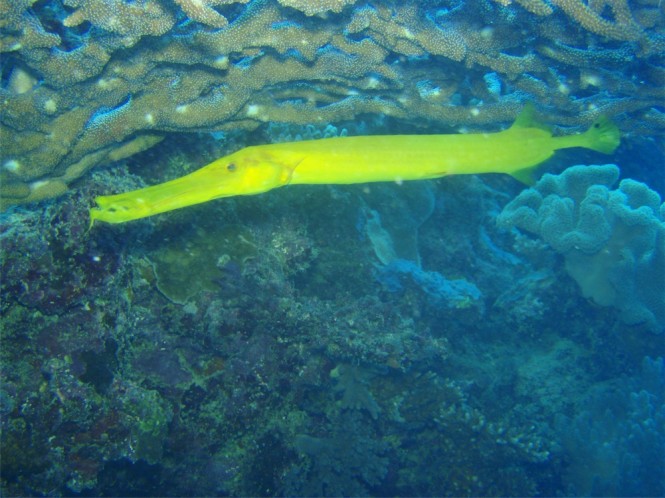 this was a big fish, and i was about 3 meters from it but still you can see the light reflecting from the over hang coral, used zoom
